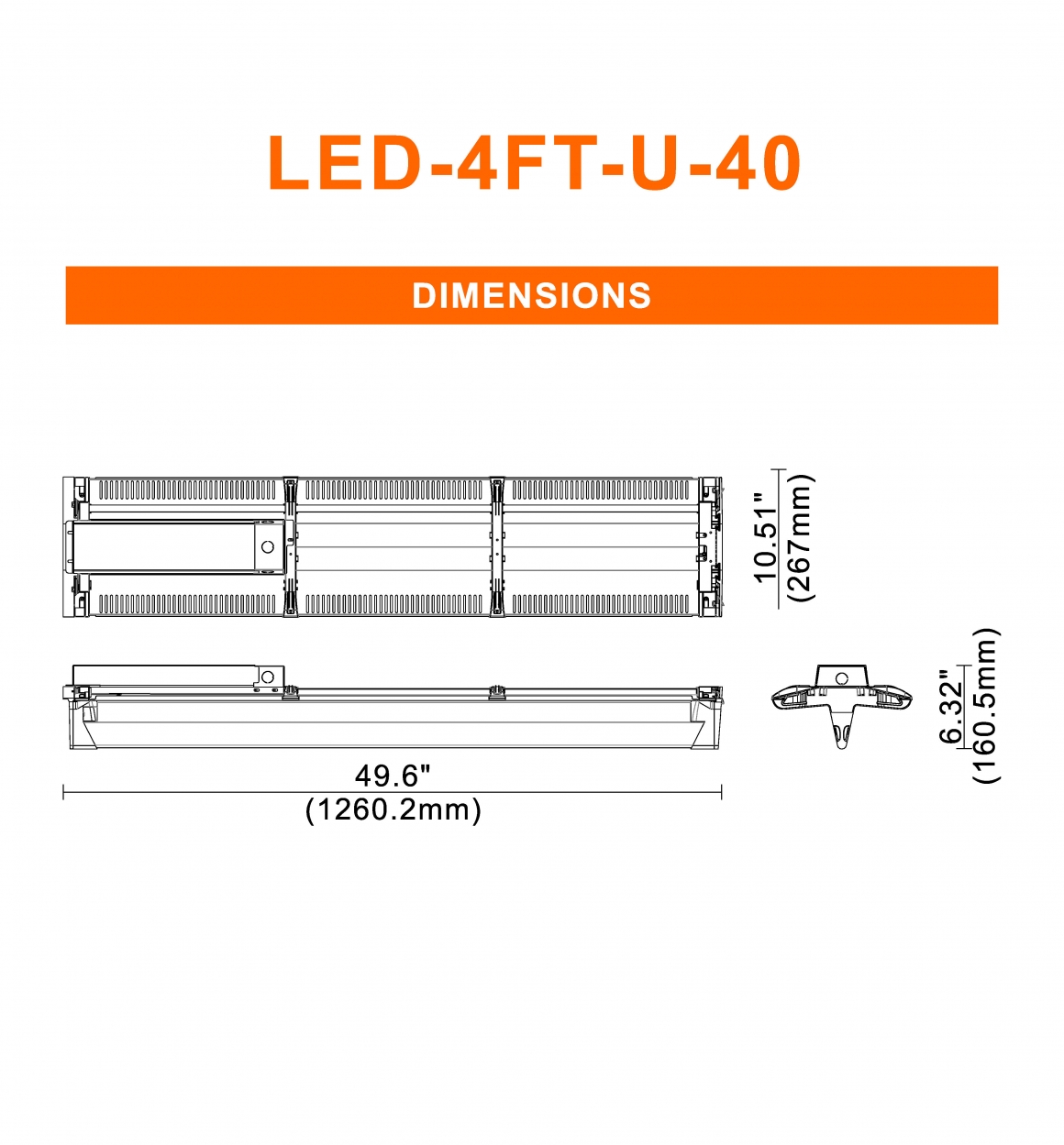 Model Number LED-4F-D/U-45 LED-4F-D/U-65 LED-4F-D/U-90 LED-8F-D/U-90 LED-8F-D/U-120 LED-8F-D/U-180 System Wattage 45W 51W 69W 81W 95W 127W Delivered Lumens (Lms.) 5317 7329 10167 10308 13844 20500 Efficacy (Lm/W) 118.21 118 118 118.35 118.50 118 Dimensions (Inches) 49.6" X 10.51" X 6.32" 92.26" X 10.51" X 6.34" Color Rendering Index (CRI) 90+ Color Temperature (CCT) 3000K / 4000K / 5000K Input Voltage 120~277VAC Build Your OrderModel